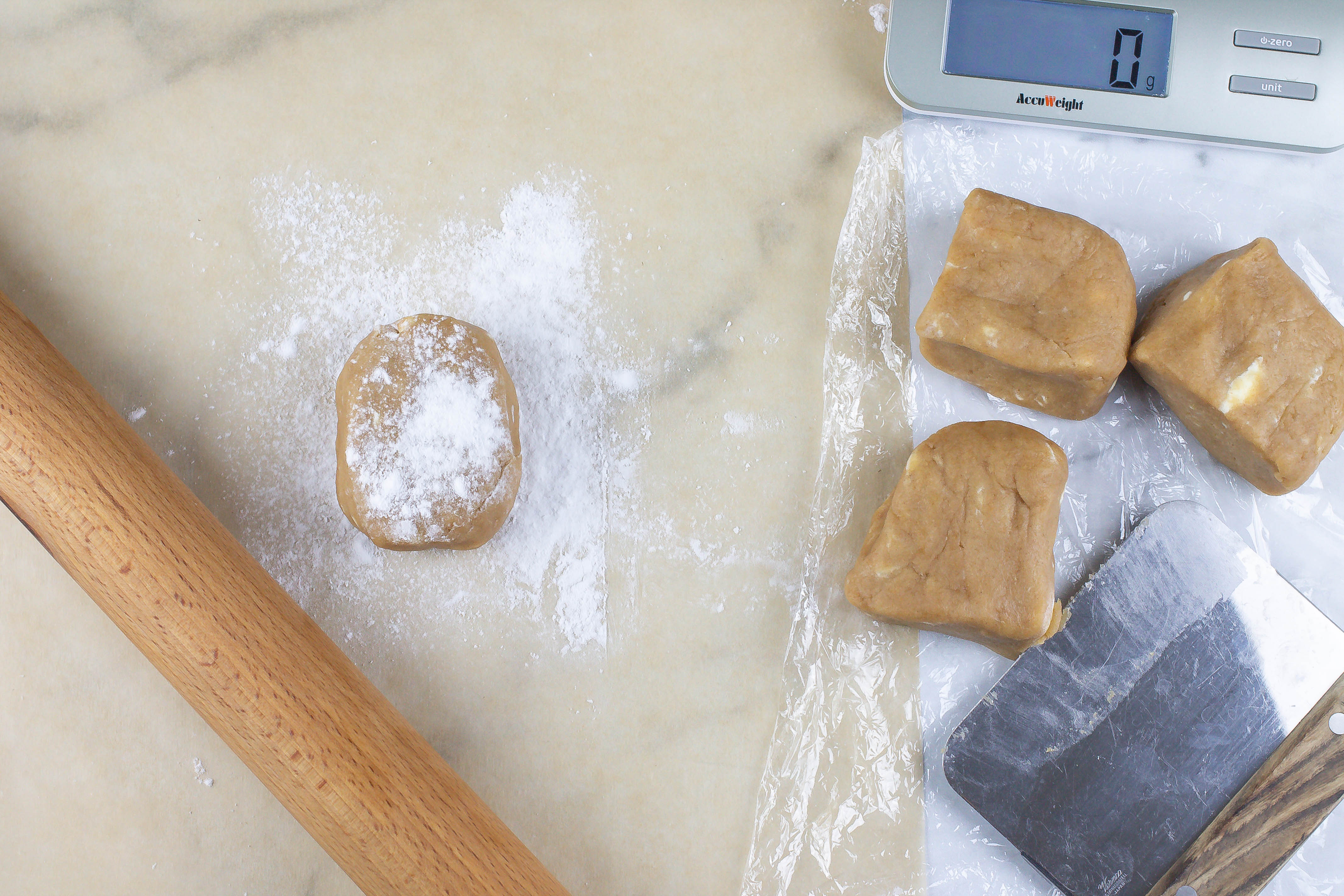6.) Roll out the dough between two sheets of parchment paper. You want to make sure you roll it pretty thinly between 1/8-1/4 of an inch thick.