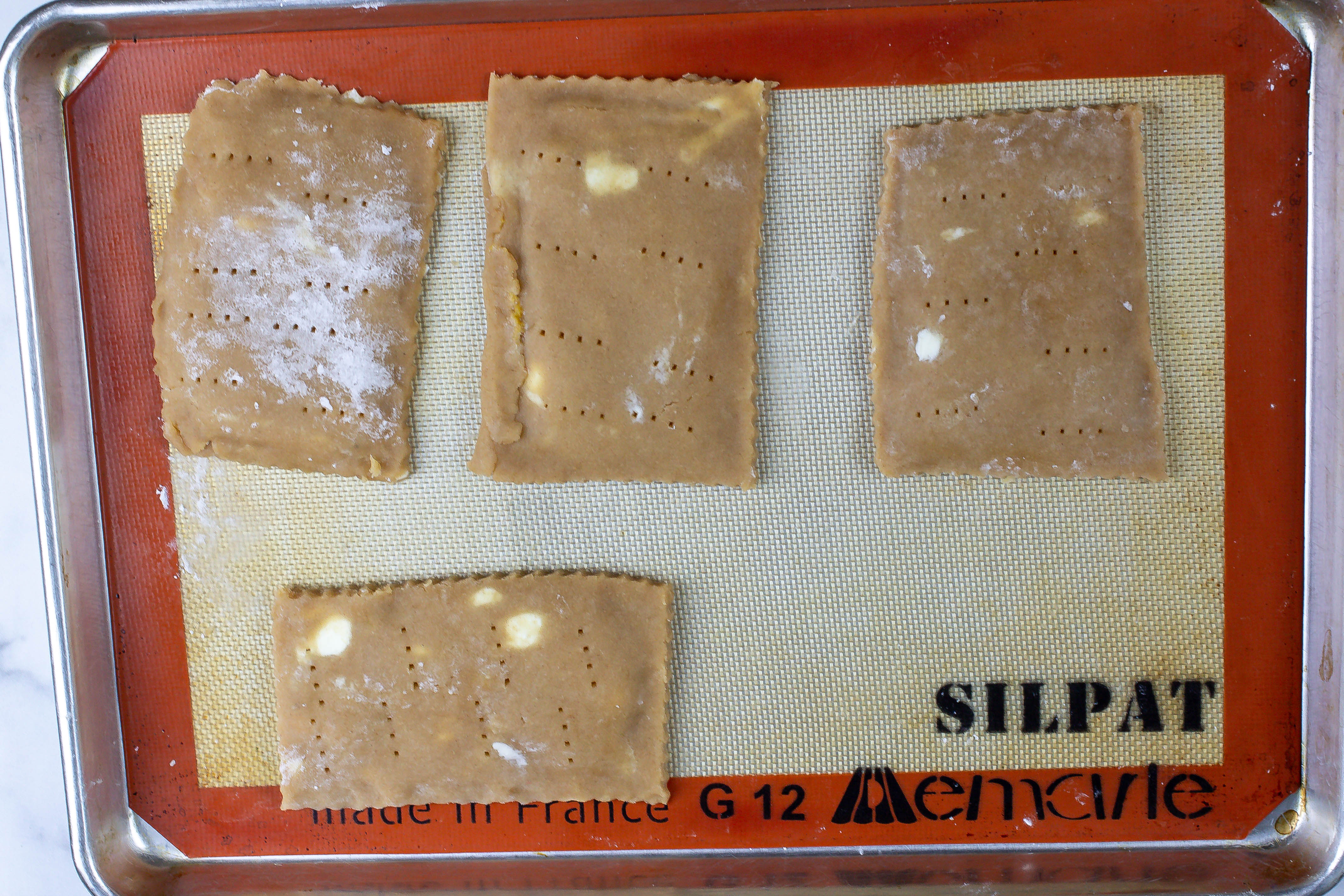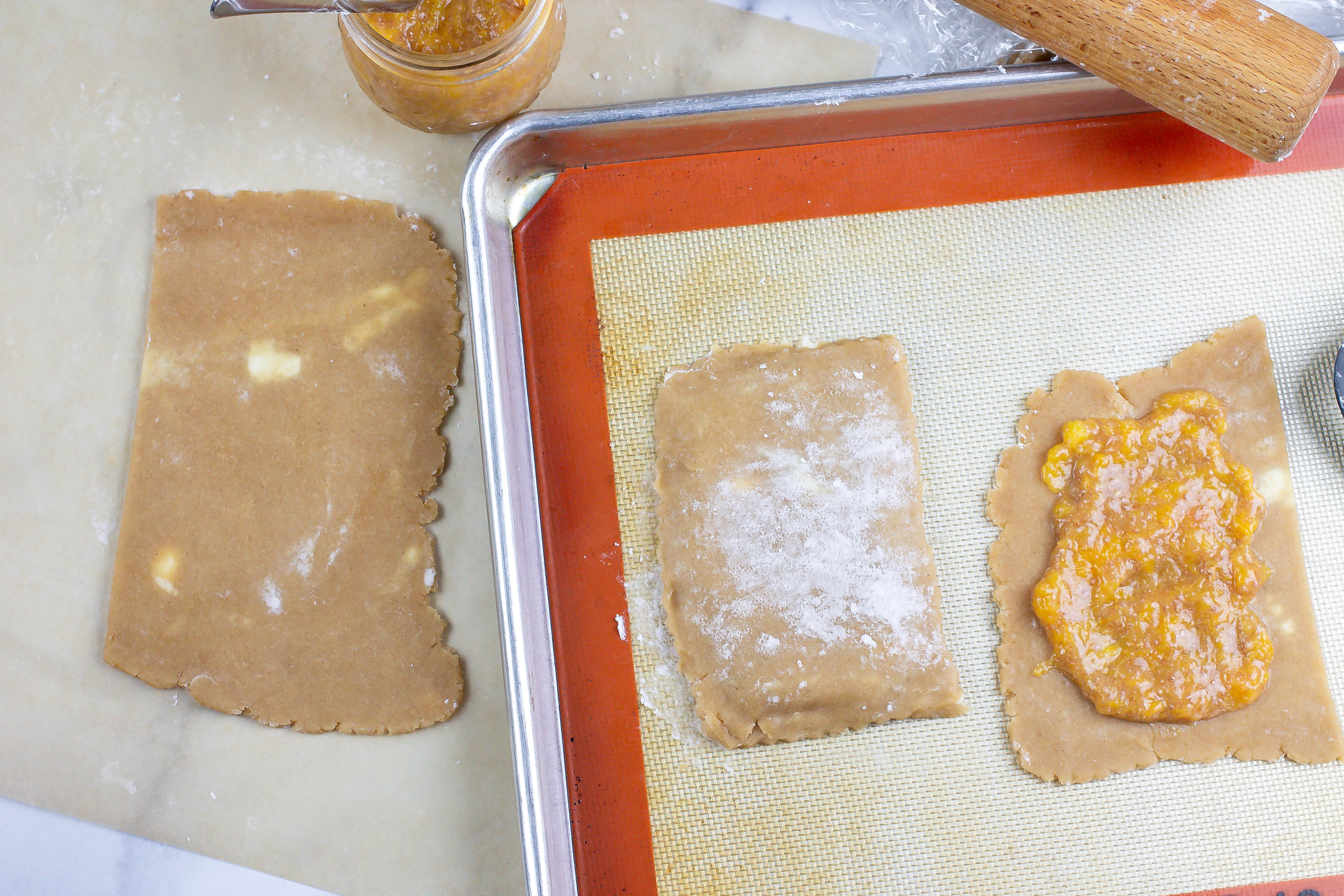 7.) Cut out 8 even rectangles and using a spatula, move them to a cookie sheet lined with parchment paper or a Silpat**. Spoon about 2 tablespoons of the peach jam into the middle of each bottom crust. Be sure to leave an edge around the pop tart that doesn’t have jam on it. Carefully place the top crust over the bottom crust and crimp to close and seal so that the jam doesn’t leak out.