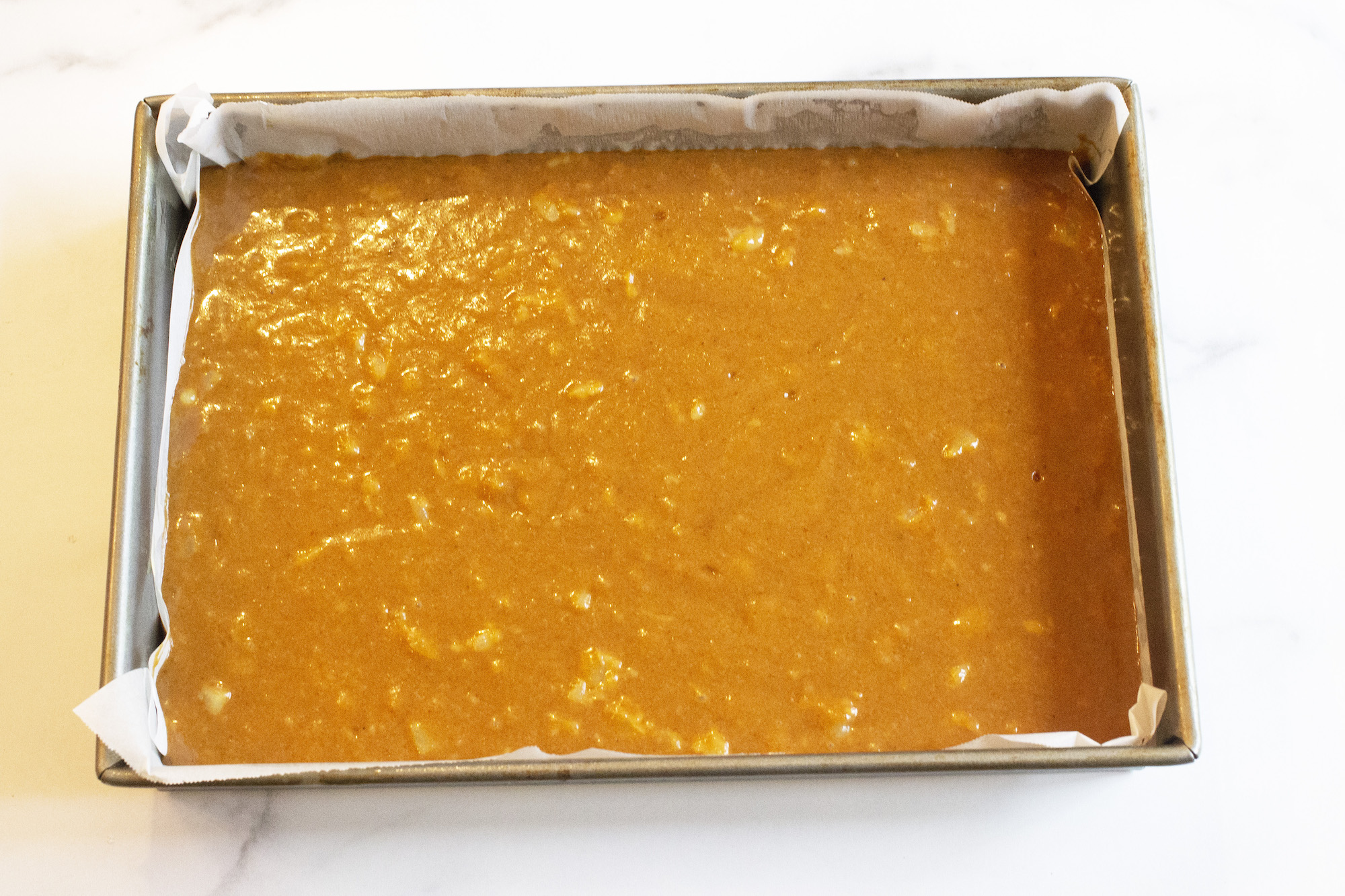 1.) Preheat your oven to 350°. Line a 13 x 9 pan with parchment paper and set aside.