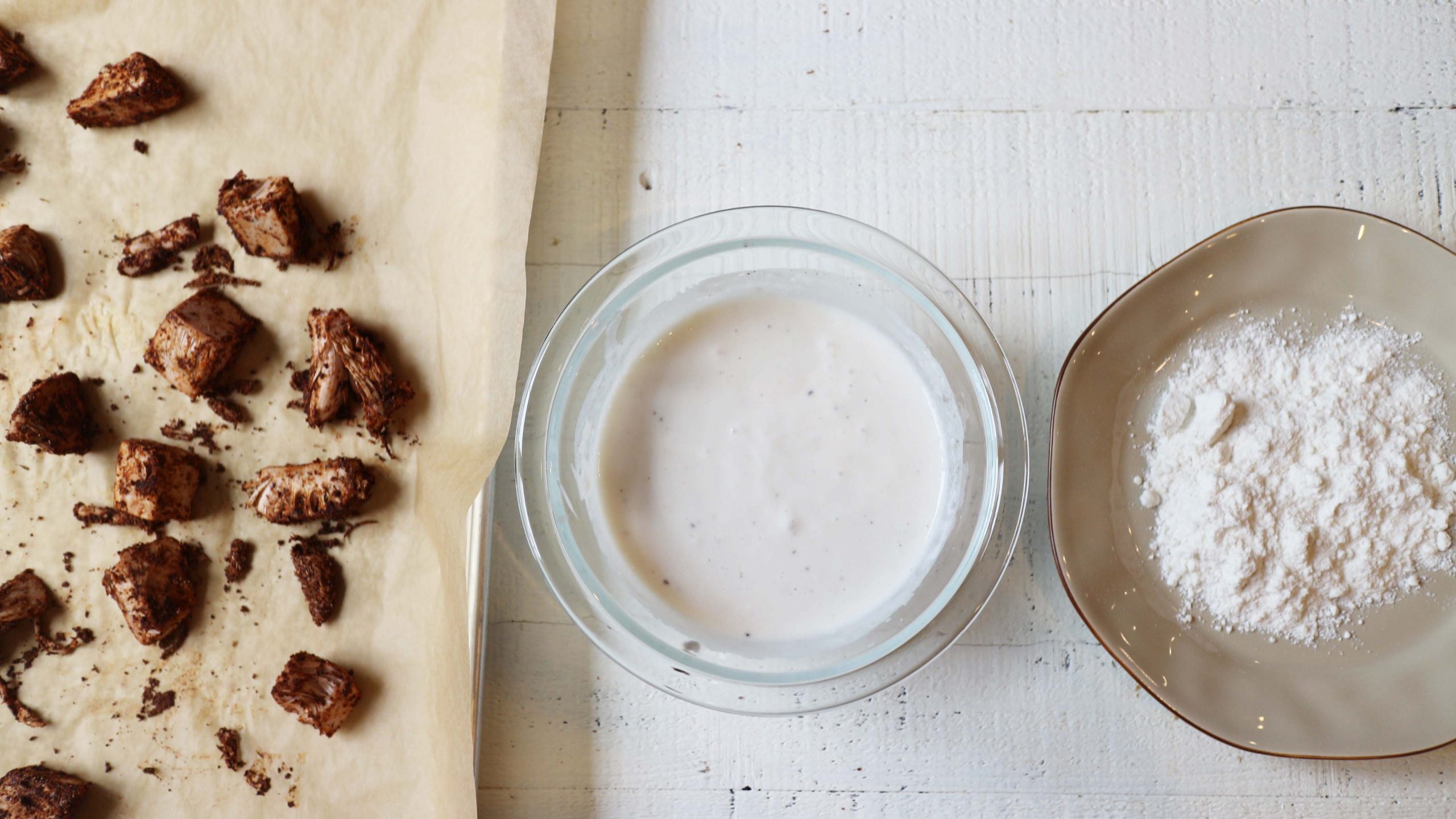 - Heat a large pan with vegetable oil over medium-high heat – you will want enough oil so that the nugget is about halfway dunked in the oil. This will vary depending on the size of pan you use. Remove the jack fruit from the oven and individually dip each nugget into the coating/batter and then into the flour and set aside.