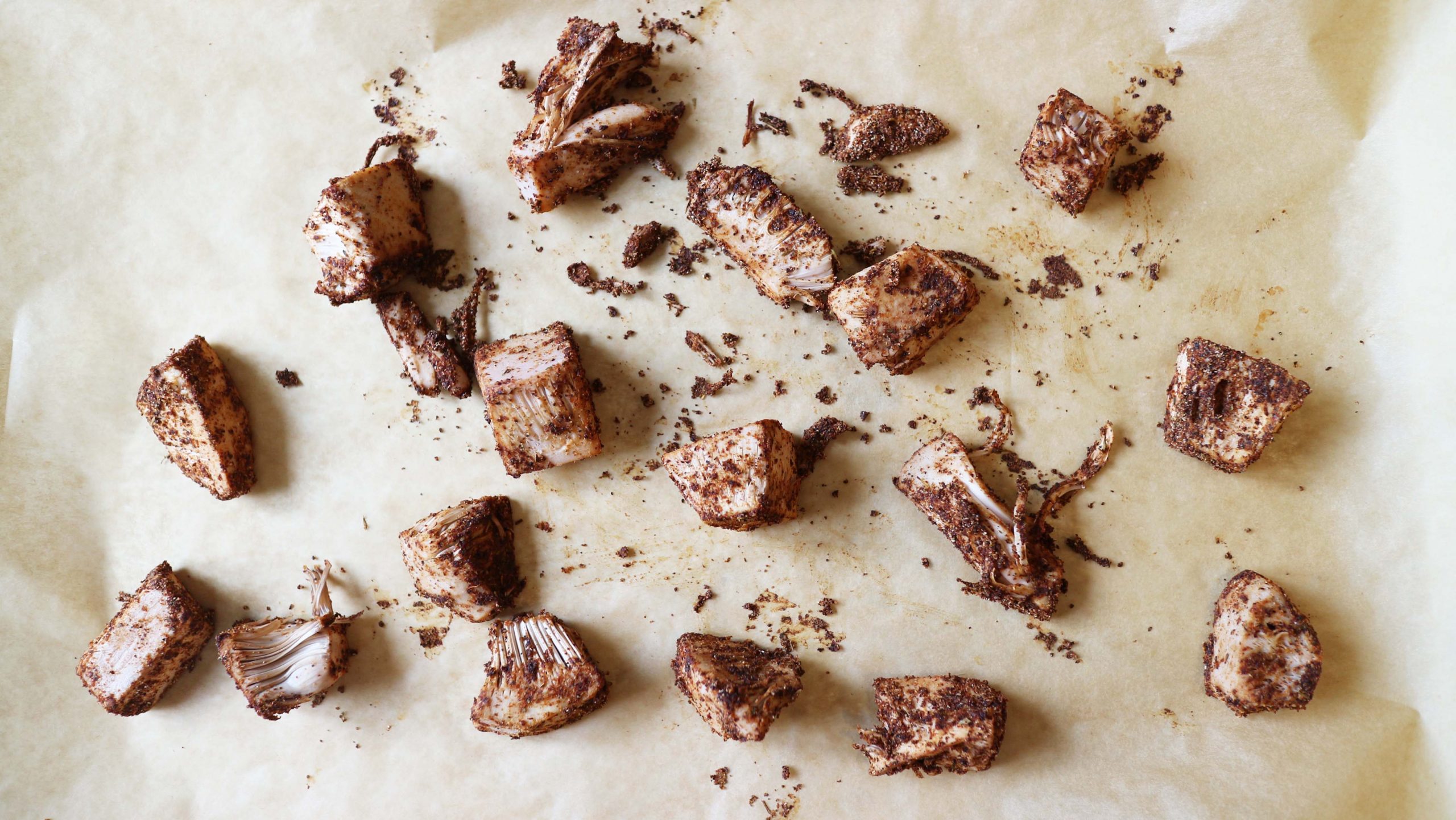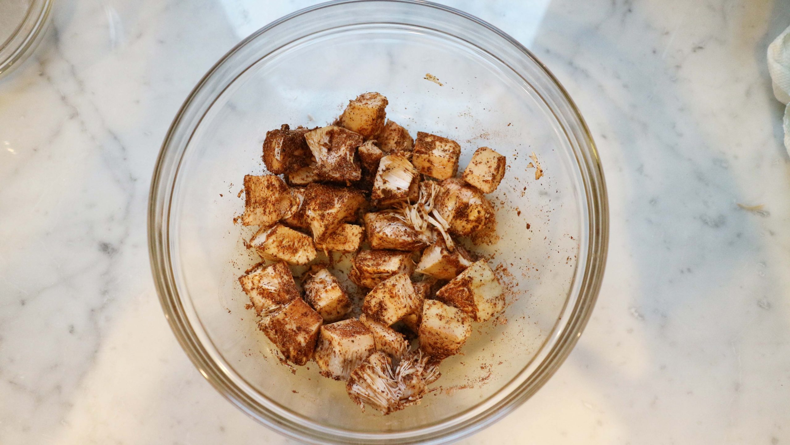 - Assemble to spice mixture in a medium-sized bowl and use a whisk to make sure all the spices are blended together. Toss the jack fruit nuggets in the spice mixture and make sure they are all evenly coated.