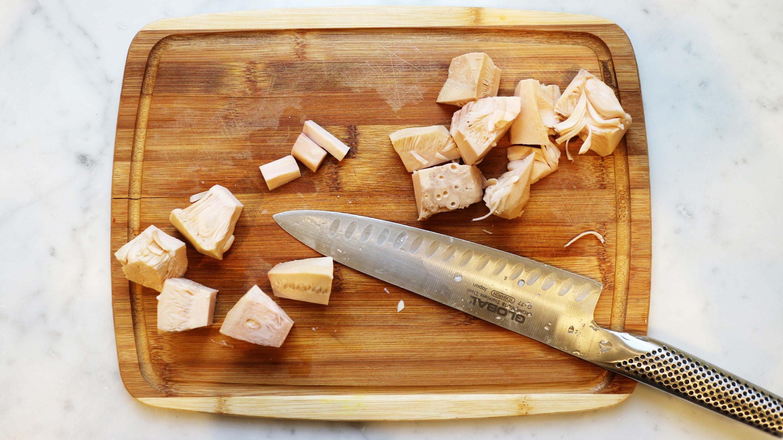 - Preheat your oven to 350°. Drain and rinse the jack fruit and trim the hard core ends. You should be left with bite-sized chunks of jack fruit. If you are serving these with our Vegan Ranch Dressing, we suggest you make that first so it can be chilling while you make the nuggets or make the dressing ahead of time.