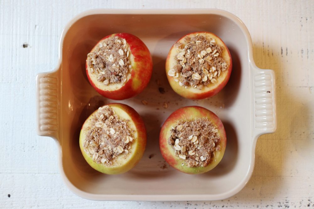 4.) Place the cored apples in a small oven-proof dish (we used a 9×9 square dish) and fill each apple with the filling.
