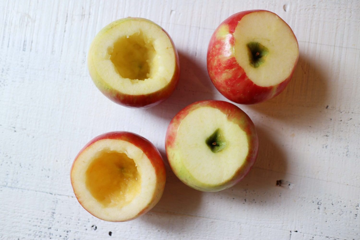 1.) Preheat oven to 400°. Wash and carefully core each apple and spoon out enough flesh to leave a hole for the filling.